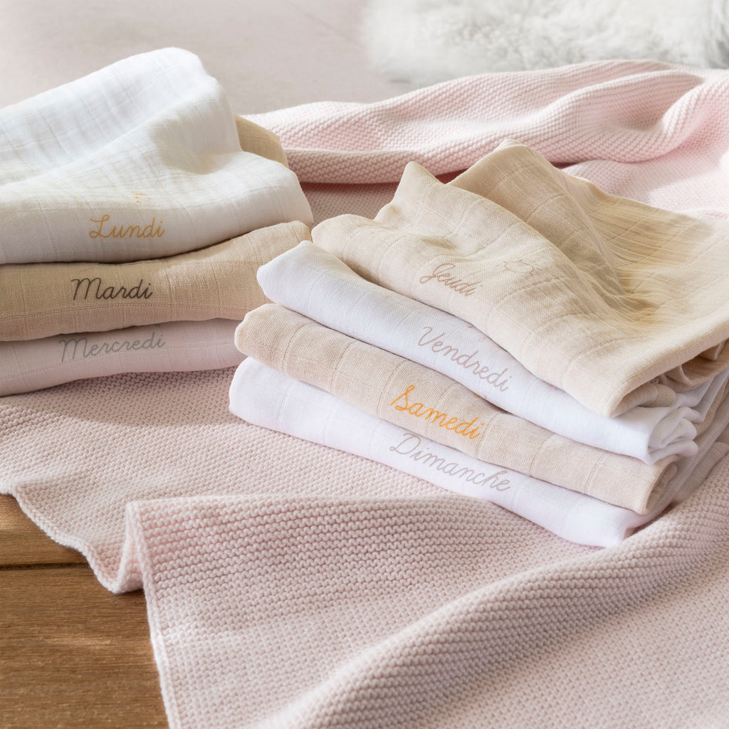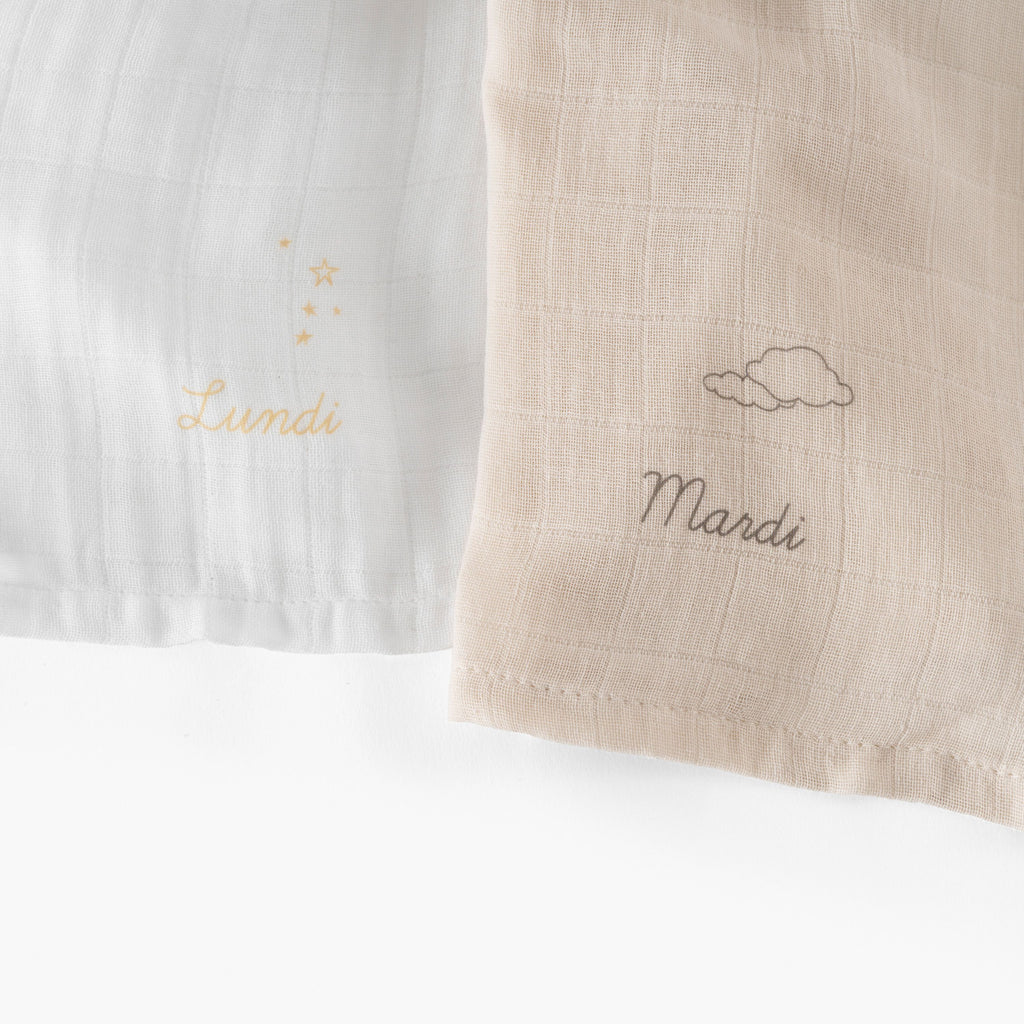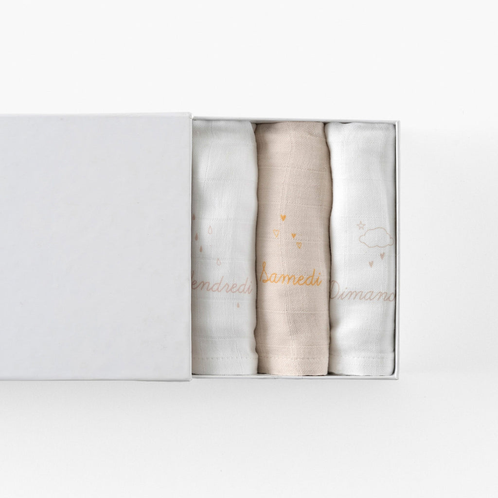 Choose the Bienvenue diaper set to celebrate every day with baby's arrival. Inside, you'll find 4 white diapers and 3 natural diapers, all neatly packaged in a drawer box.