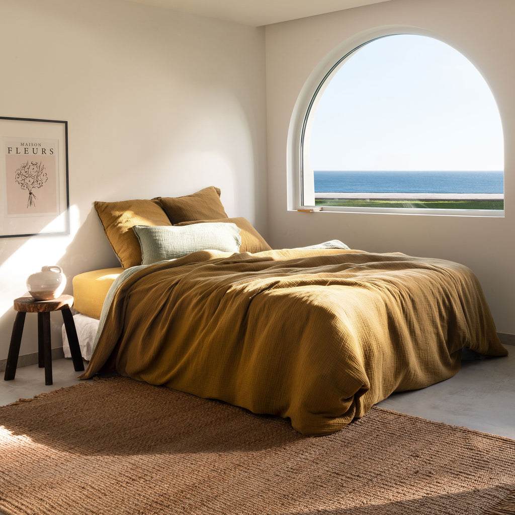 Opt for a bed linen with multiple possibilities with the Infini fitted sheet. Made from reversible organic cotton gauze, it is available in khaki and celadon, as well as bark and absinthe.