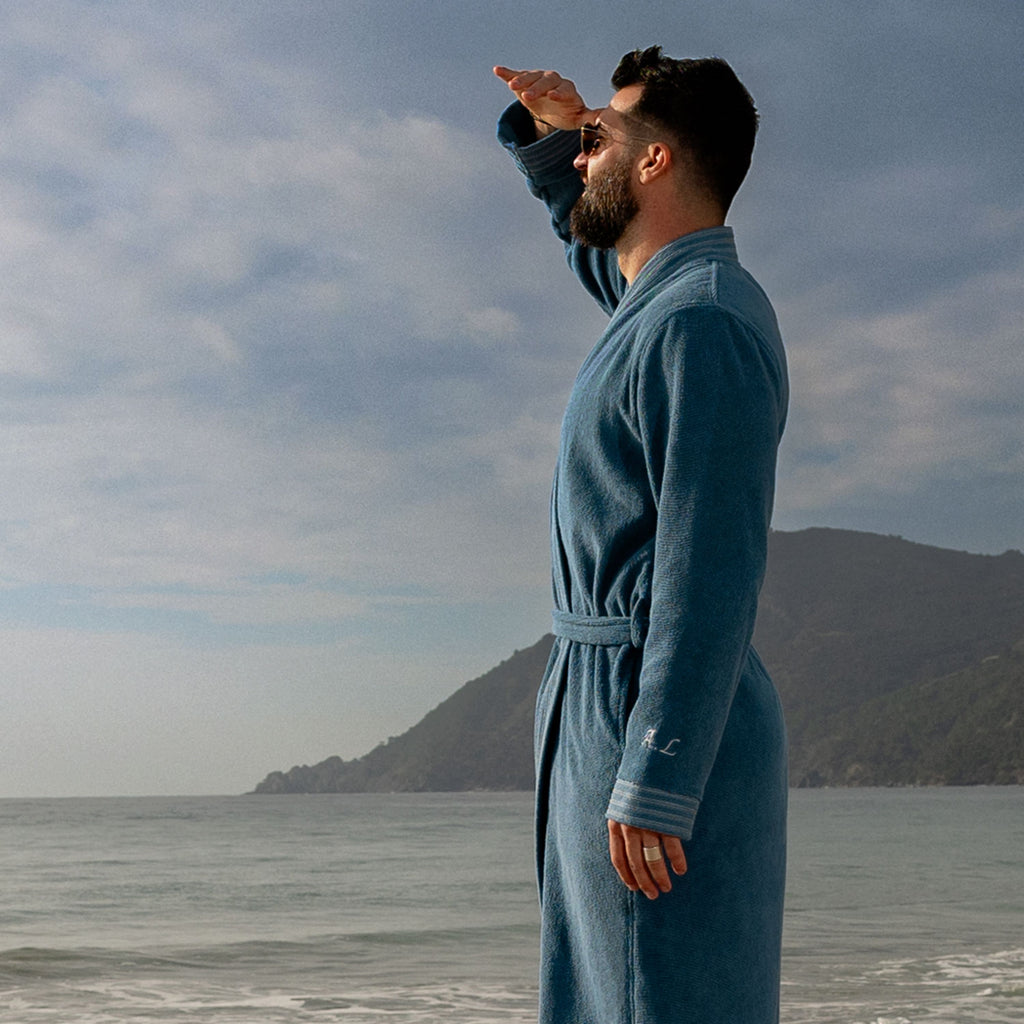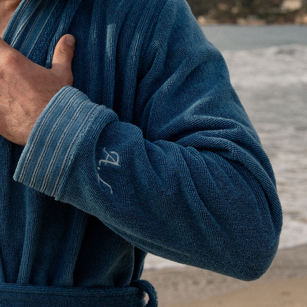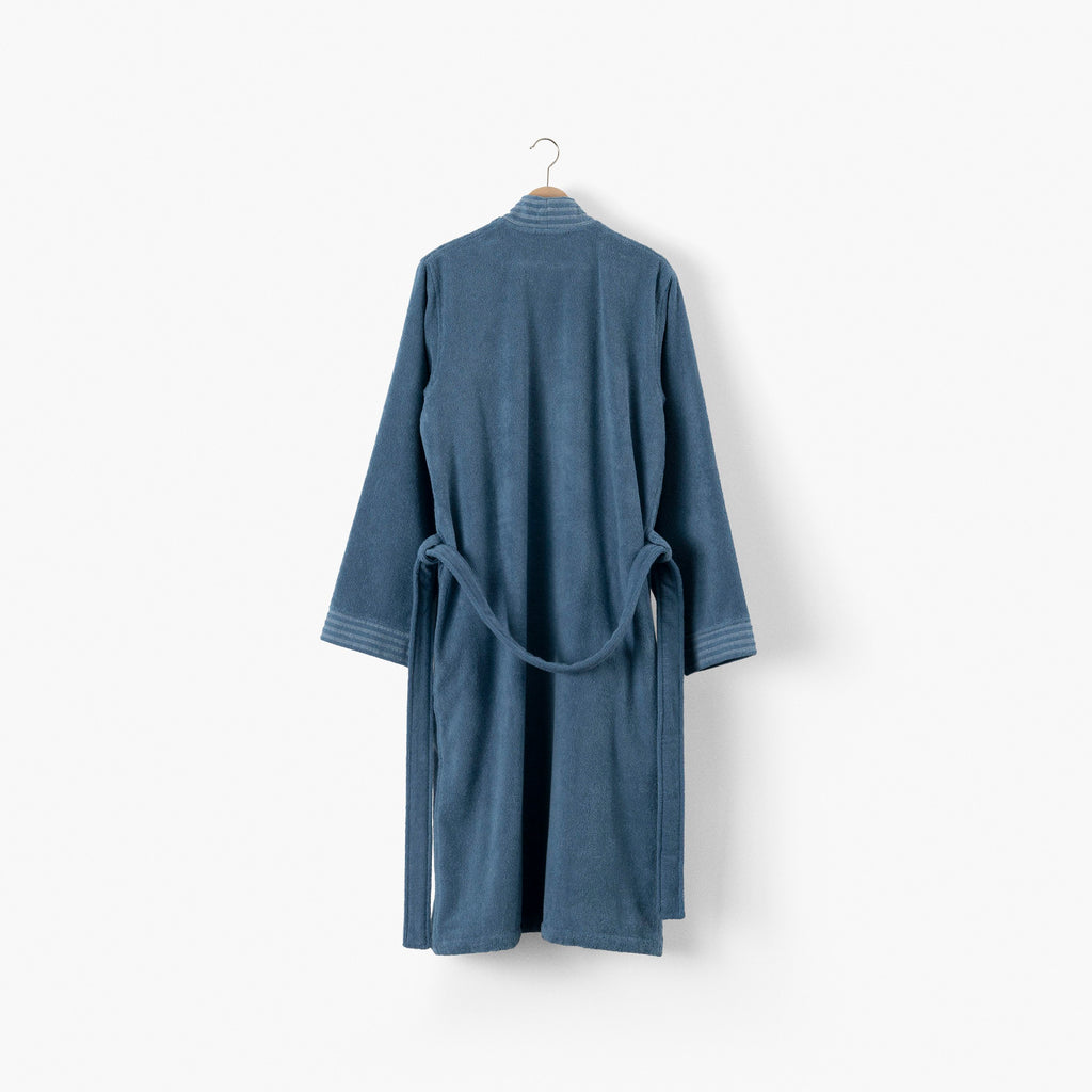 Confectionné en bouclette de coton, le peignoir de bain Demi Lune revêt un coloris bleu denim et un col kimono moderne. Laissez vous séduire par ses finitions subtiles le long du col et au bas de manche.