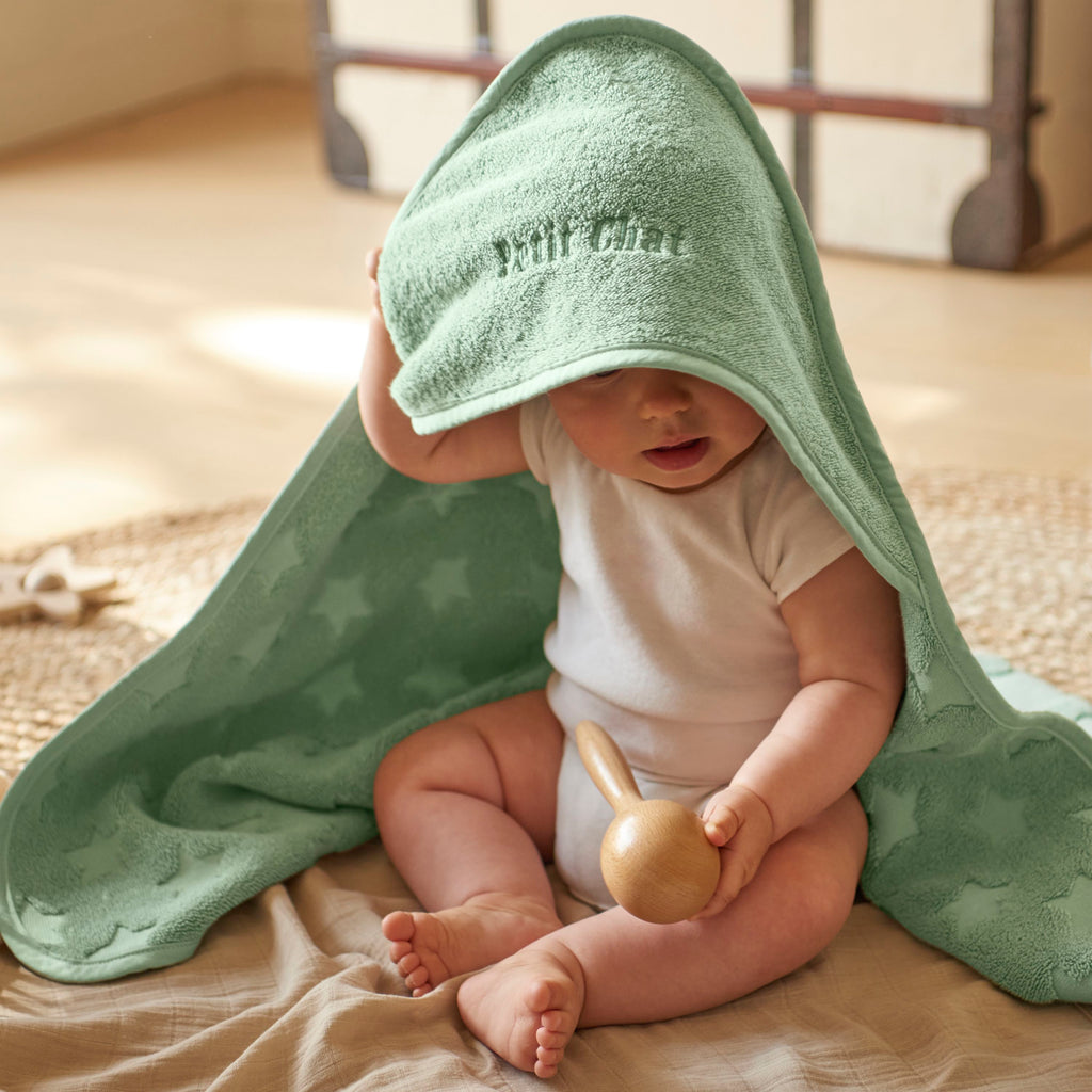 Fall for the Mon Jour bath cape in 100% cotton, available in two colors: sorbet and eucalyptus. A timeless, essential piece for this season, which you can personalize to your own taste.