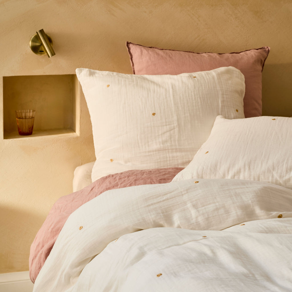 La collection Zephire associe la douceur de la gaze de coton à de délicats motifs brodés. Son style discret et raffiné s’harmonise parfaitement avec du linge de lit uni ou imprimé.