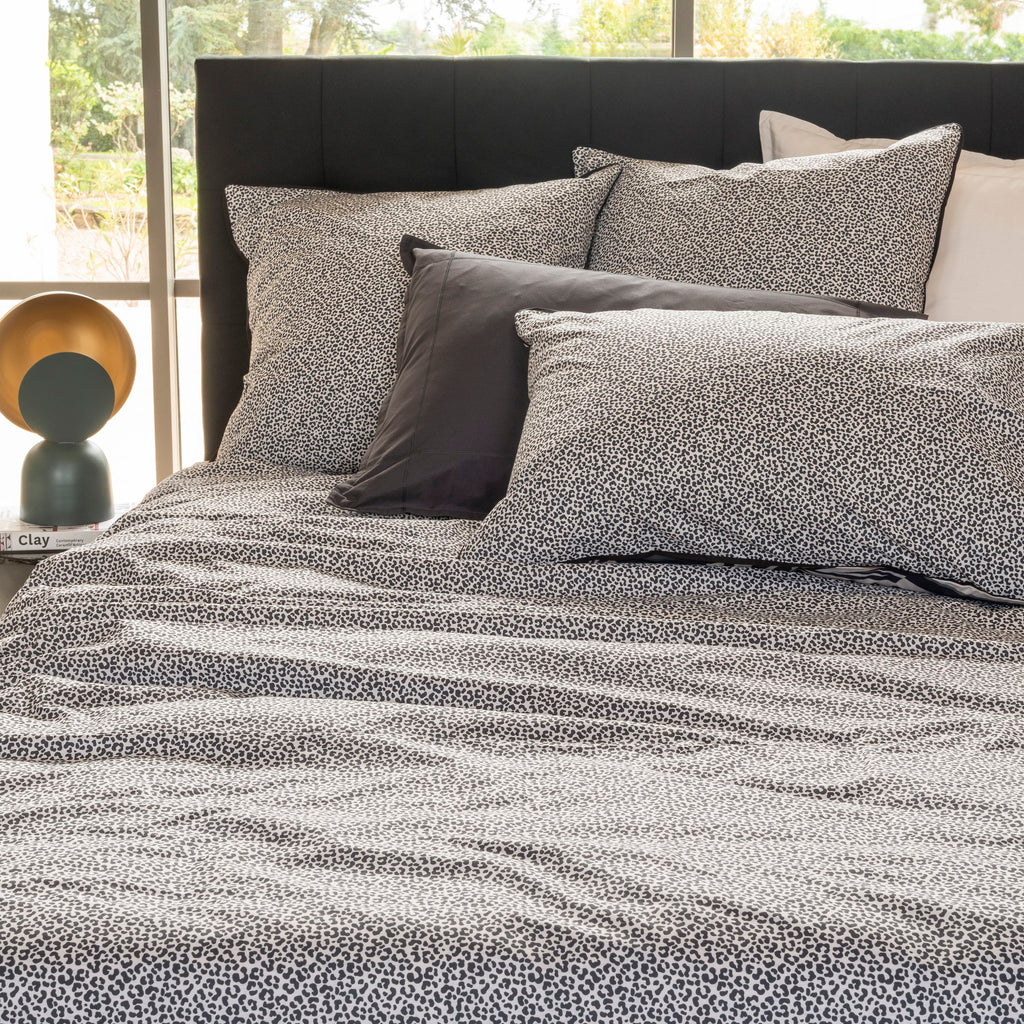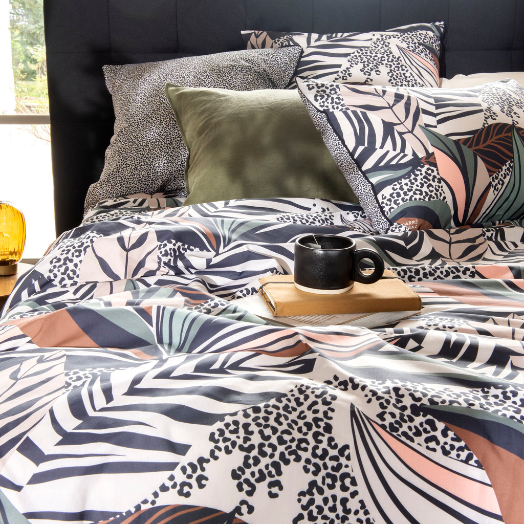 The Ysée comforter cover in organic cotton combines a graphic jungle maxi pattern with an animal print, creating a unique and captivating visual effect. Discover hidden leopard, zebra and tiger motifs.