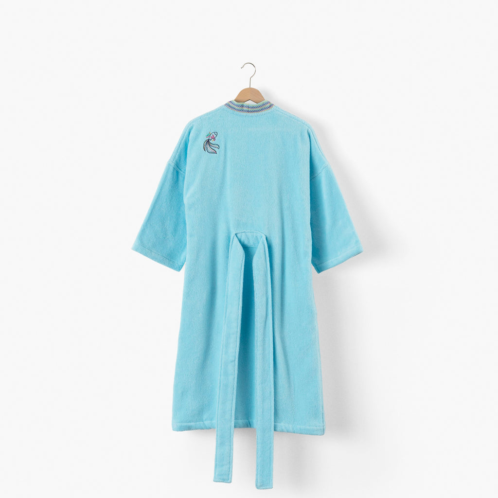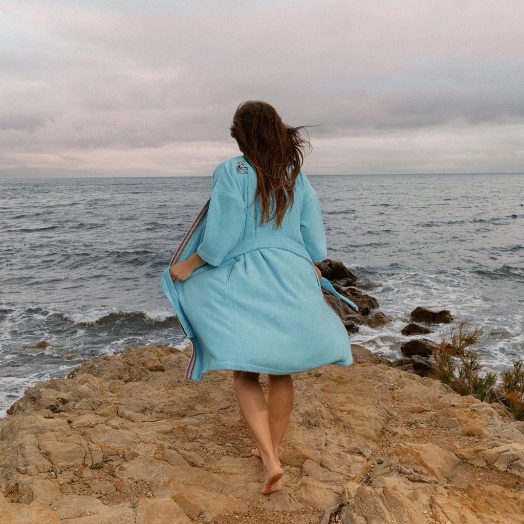 Confectionné en bouclette de coton, le peignoir de bain Demi Lune revêt un coloris bleu lagon et un col kimono moderne. Laissez-vous séduire par ses finitions subtiles le long du col.