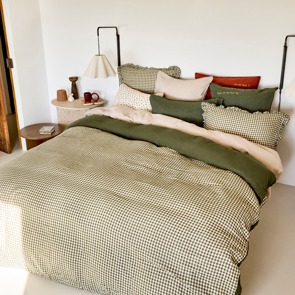 Abelia combineert gemakkelijk met lichte effen kleuren zoals linnen, beige of gebroken wit. Je kunt je beddengoedset aanvullen met een plaid of kussens met textuur om de warme uitstraling van de collectie te versterken.