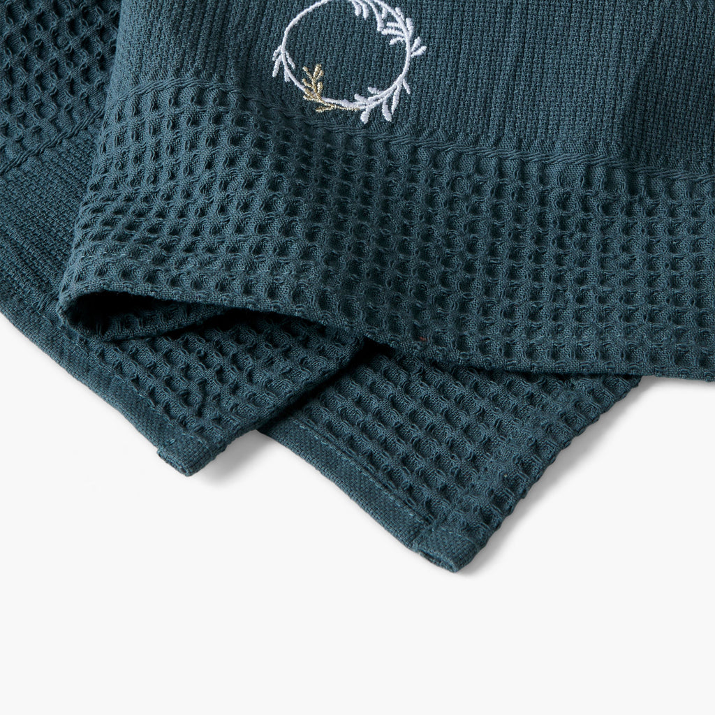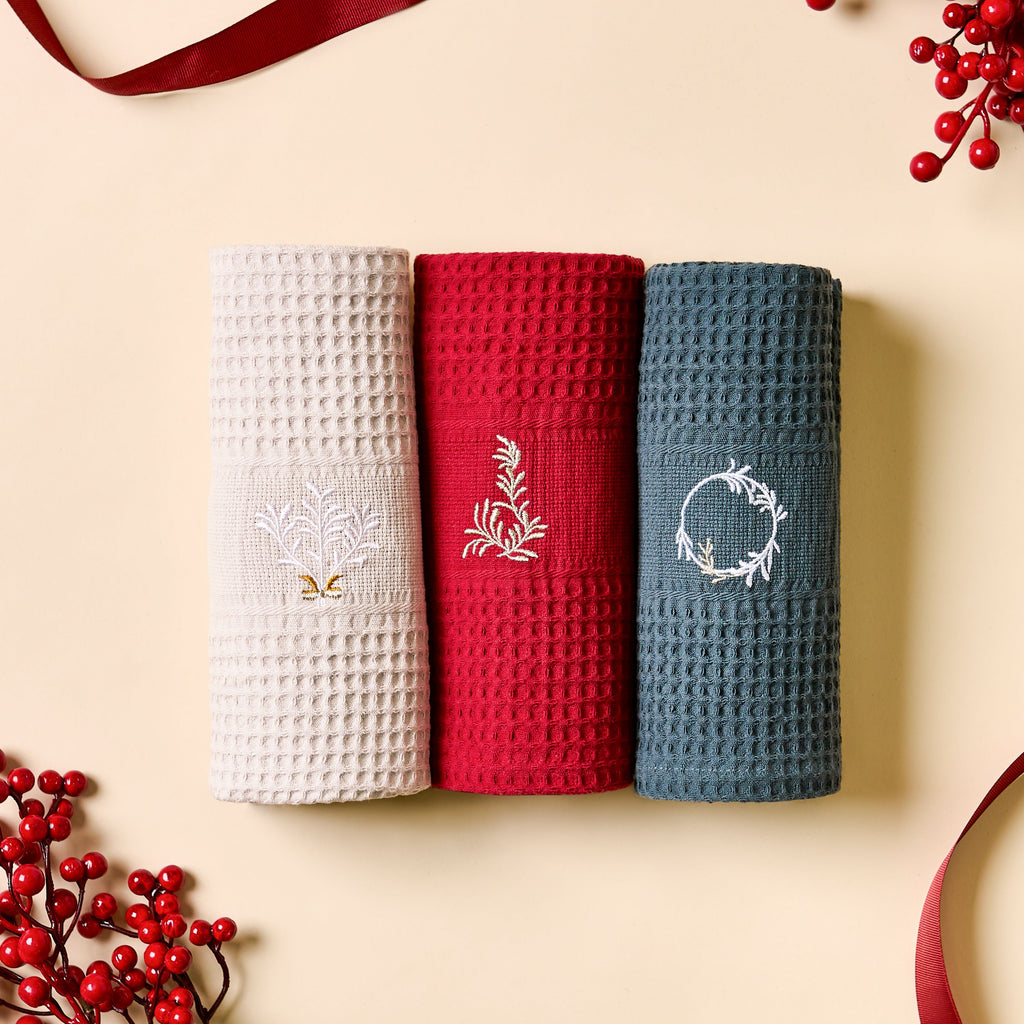 Dompel je huis onder in de magie van Kerstmis met deze collectie geborduurde theedoeken en handdoeken. Gestileerde dennenbomen, delicate kransen of verfijnde sneeuwvlokken: elk motief roept de warme, magische geest van de feestdagen op.