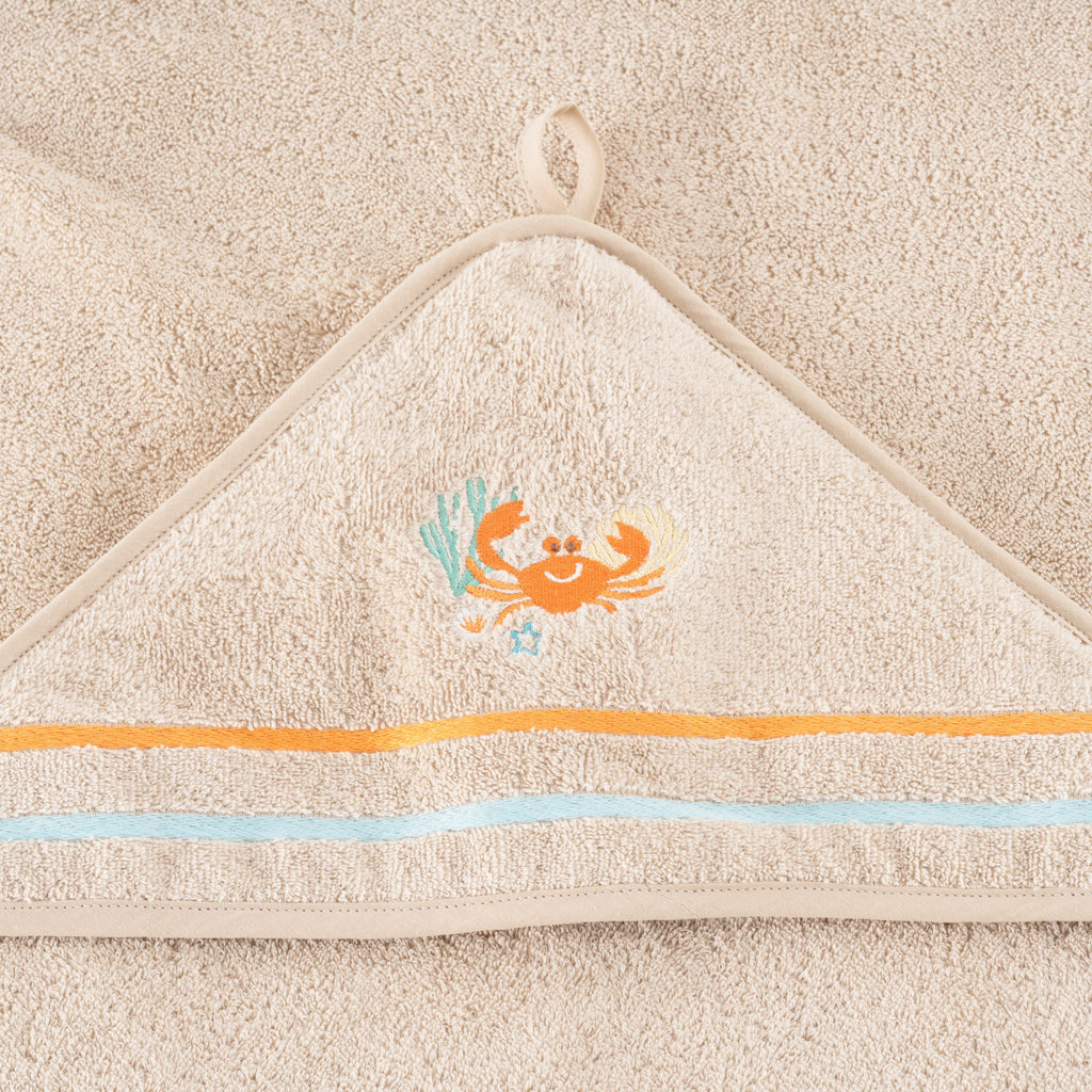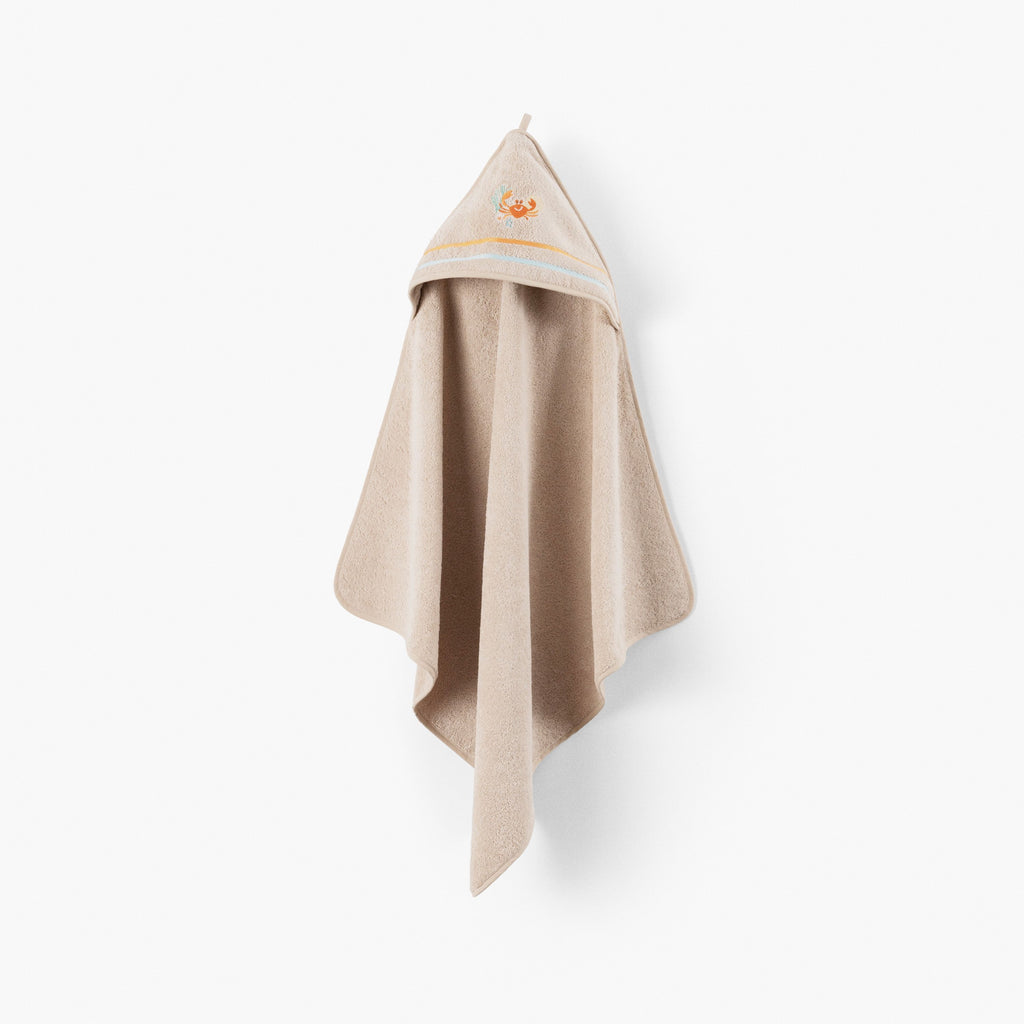 La collection Escapade marie des couleurs vives à un fond sable tout doux. Une broderie de crabe apporte une touche de malice, pour des moments de bain pleins de joie.