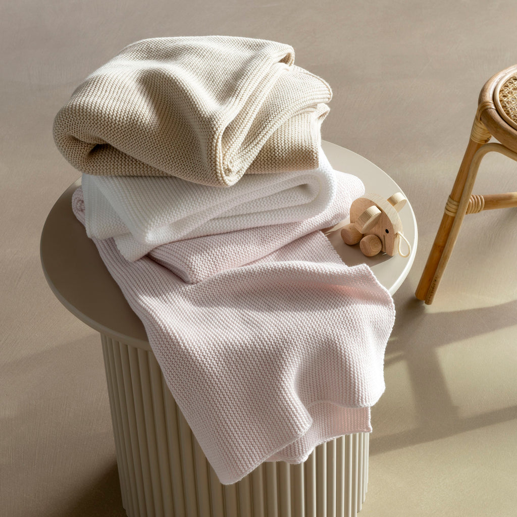 De gebreide deken Bienvenue is een must-have voor de komst van je baby. De mossteek roept herinneringen op aan de dekens van onze grootmoeders. Verkrijgbaar in drie kleuren: nude, wit en naturel en gemaakt van biologisch katoen met GOTS-certificaat.