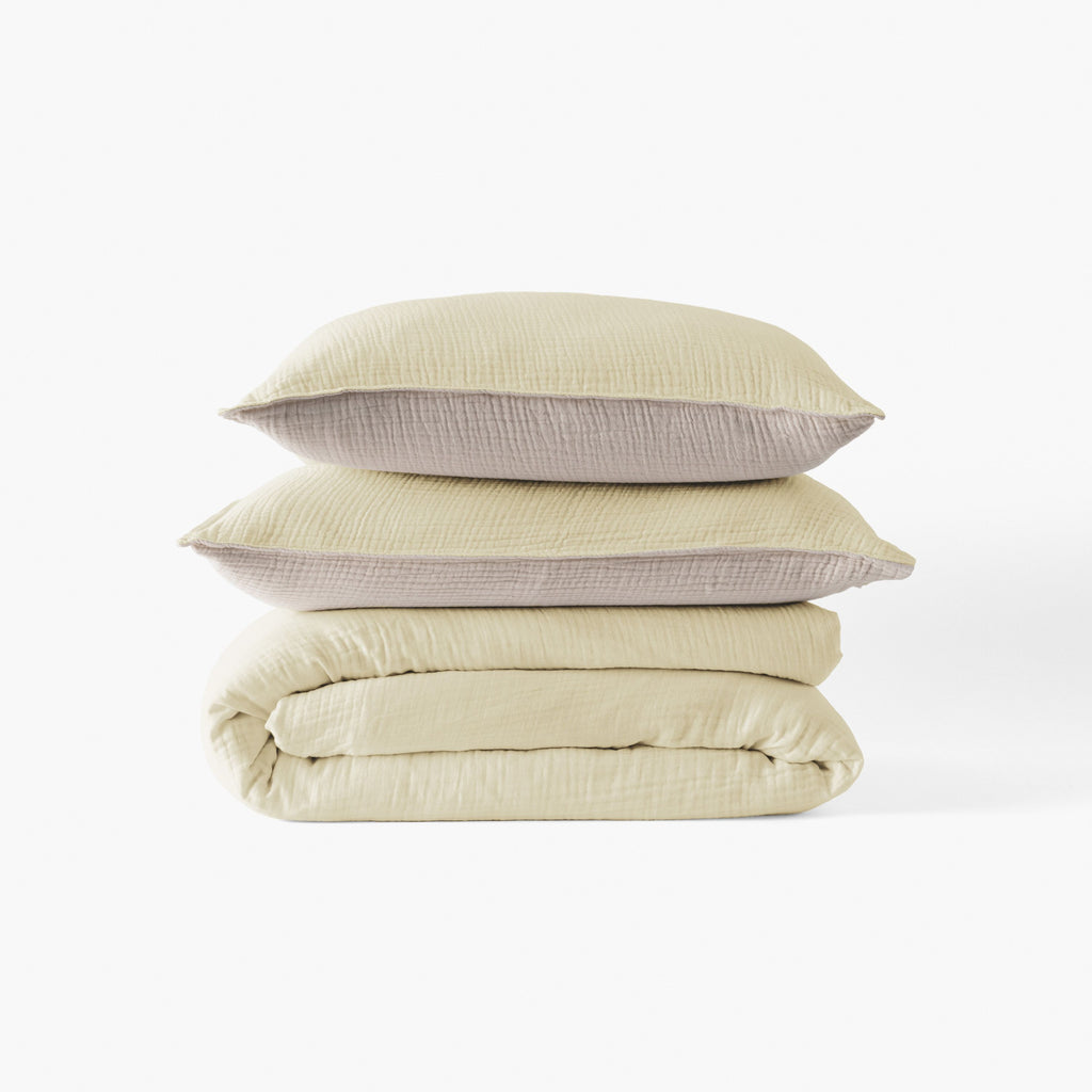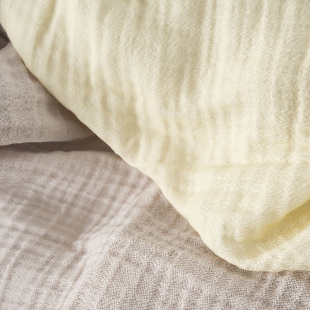 Het Infini dekbedovertrek van organisch katoenen gaas biedt je tal van mogelijkheden. Er zijn twee effen combinaties: de eerste combineert kaki met alsem en de tweede celadon met schors.