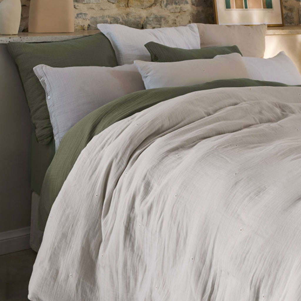 La collection Zephire associe la douceur de la gaze de coton à de délicats motifs brodés. Son style discret et raffiné s’harmonise parfaitement avec du linge de lit uni ou imprimé.