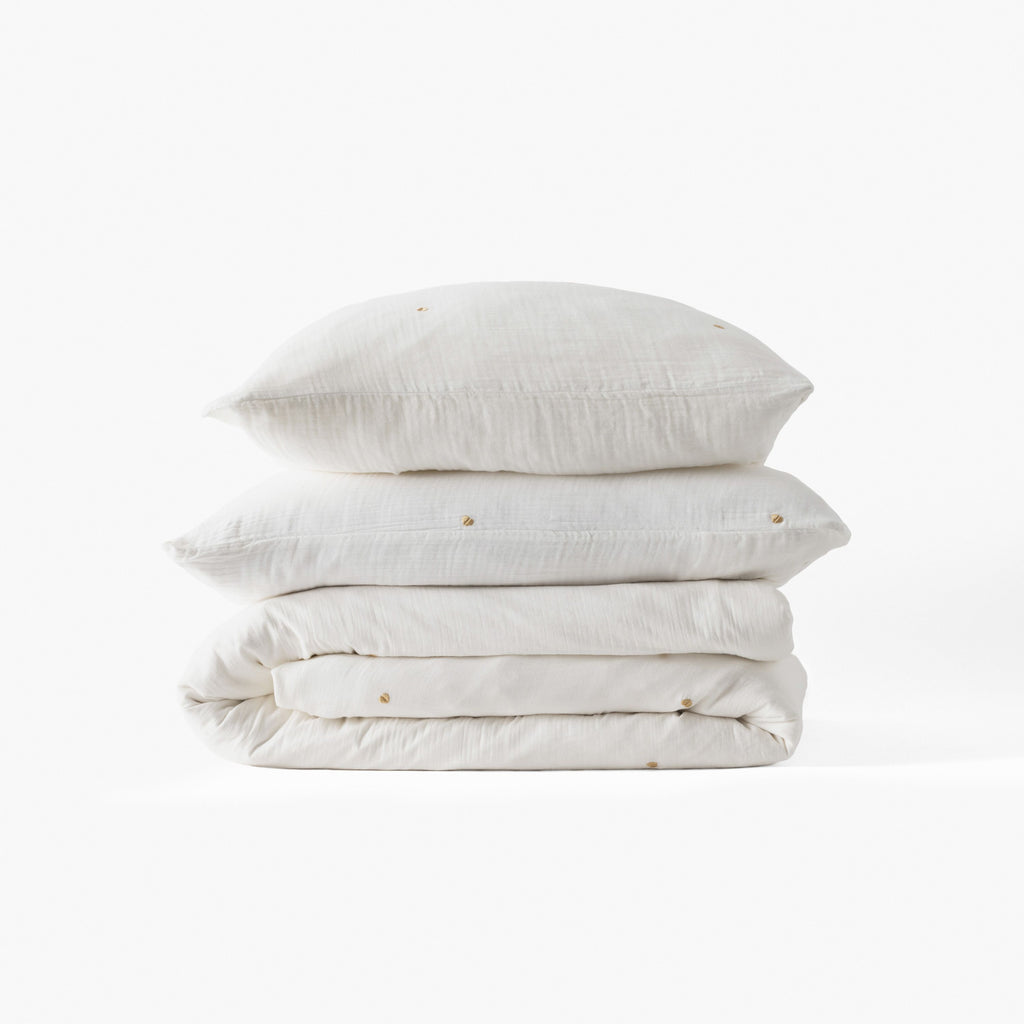 La collection Zephire associe la douceur de la gaze de coton à de délicats motifs brodés. Son style discret et raffiné s’harmonise parfaitement avec du linge de lit uni ou imprimé.