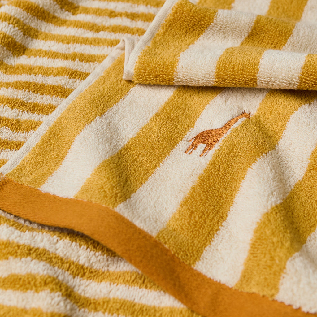 Kies voor een badlinnencapsule waarbij brede strepen aan de ene kant contrasteren met fijnere strepen aan de andere kant, waardoor een mooi contrast ontstaat. Borduursels van giraffes of dinosaurussen voegen een vleugje fantasie en affectie toe.