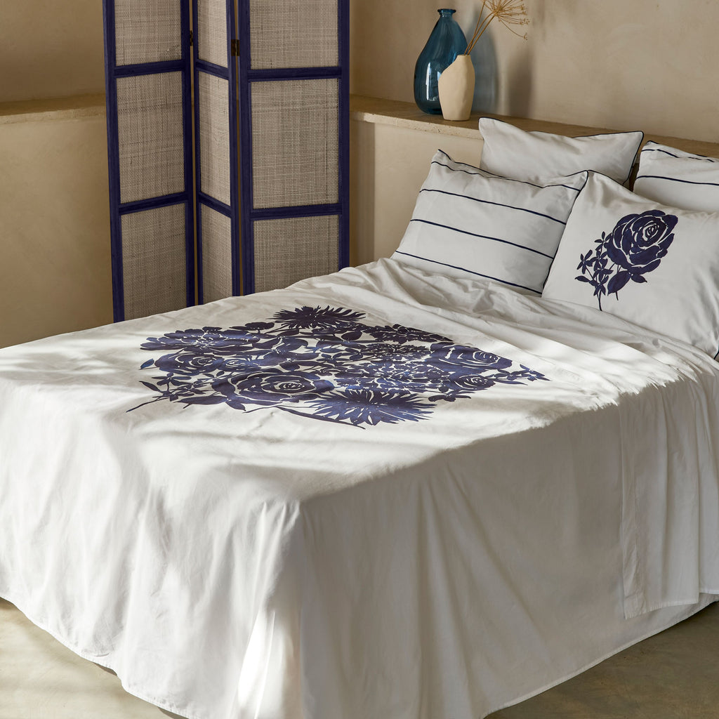 De Rosablue-collectie is een poëtische mix van bloemenelegantie en zeegeest. De subtiel met de vrije hand geschilderde strepen en het monochroom blauwe boeket vormen een waar zeegezicht.