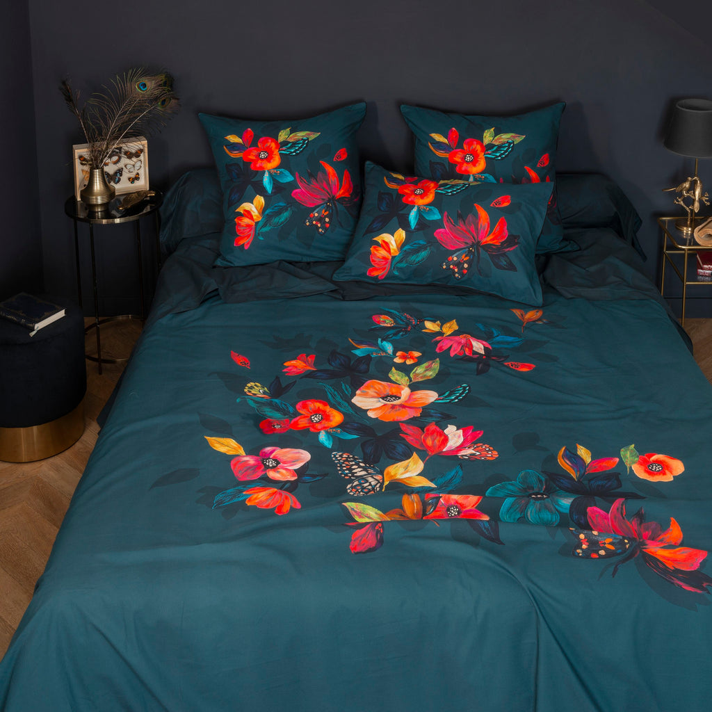 Het Eclats-bedlaken verleidt je met zijn subtiele contrasten tussen een donkere achtergrond en felle kleuren, waardoor een fascinerend beeld ontstaat. Het is een werk van dubbele interpretatie dat ook vlinders onthult.