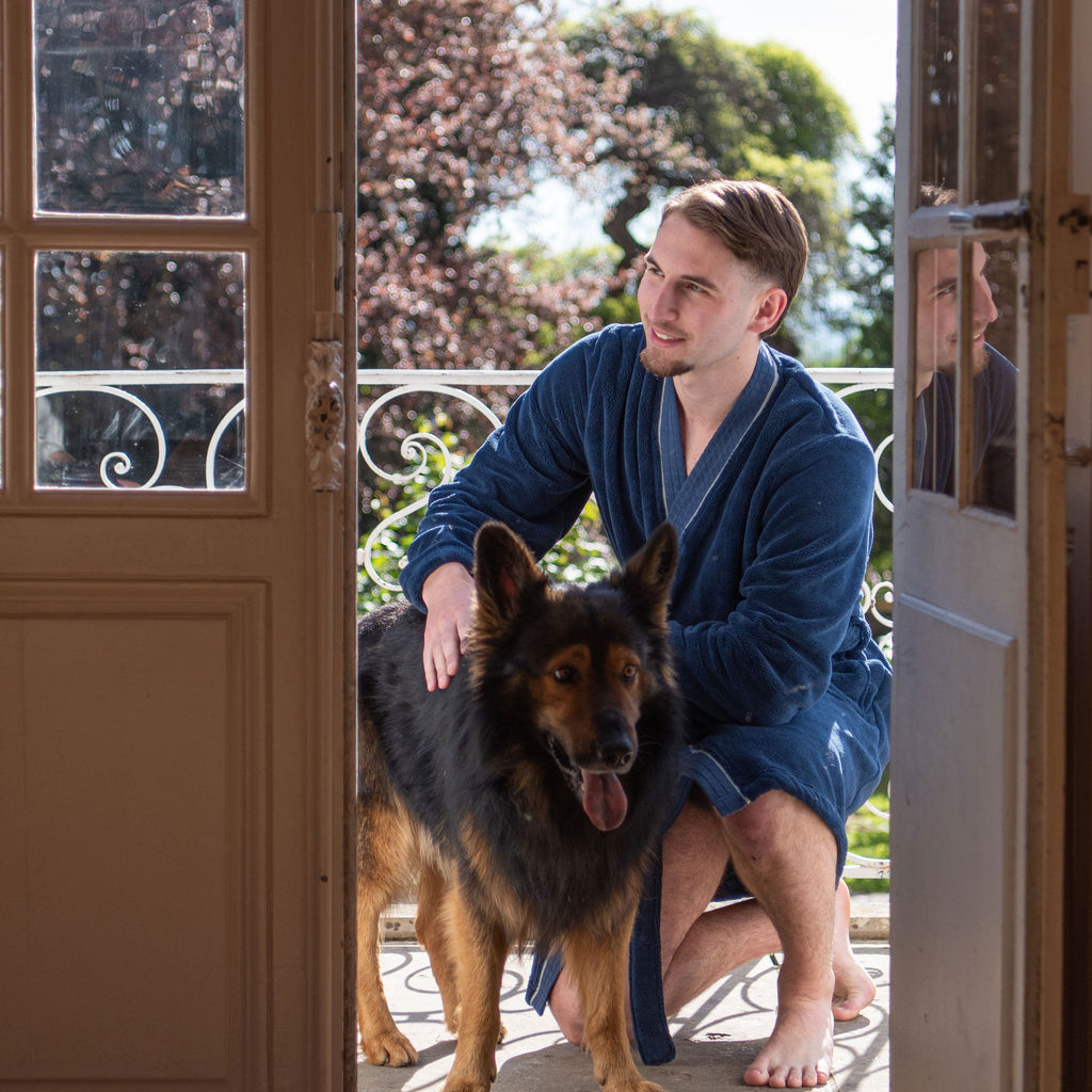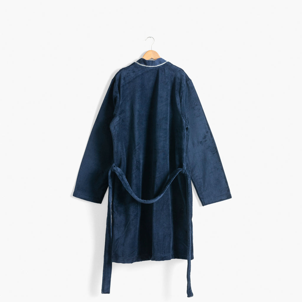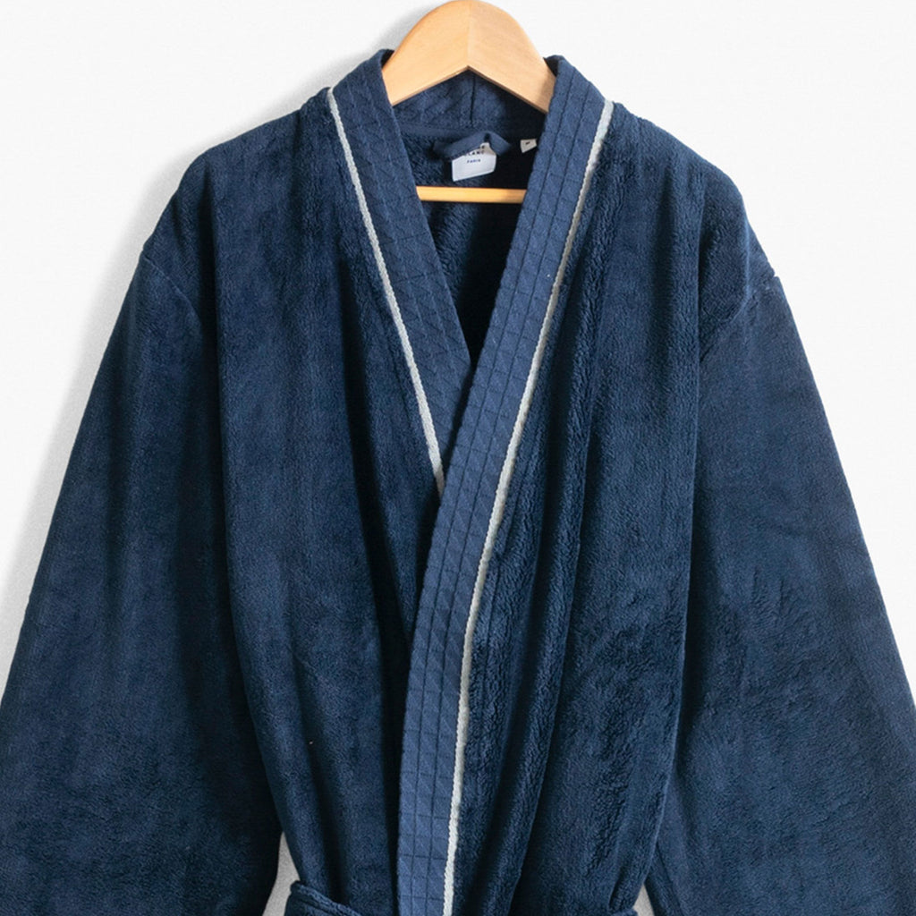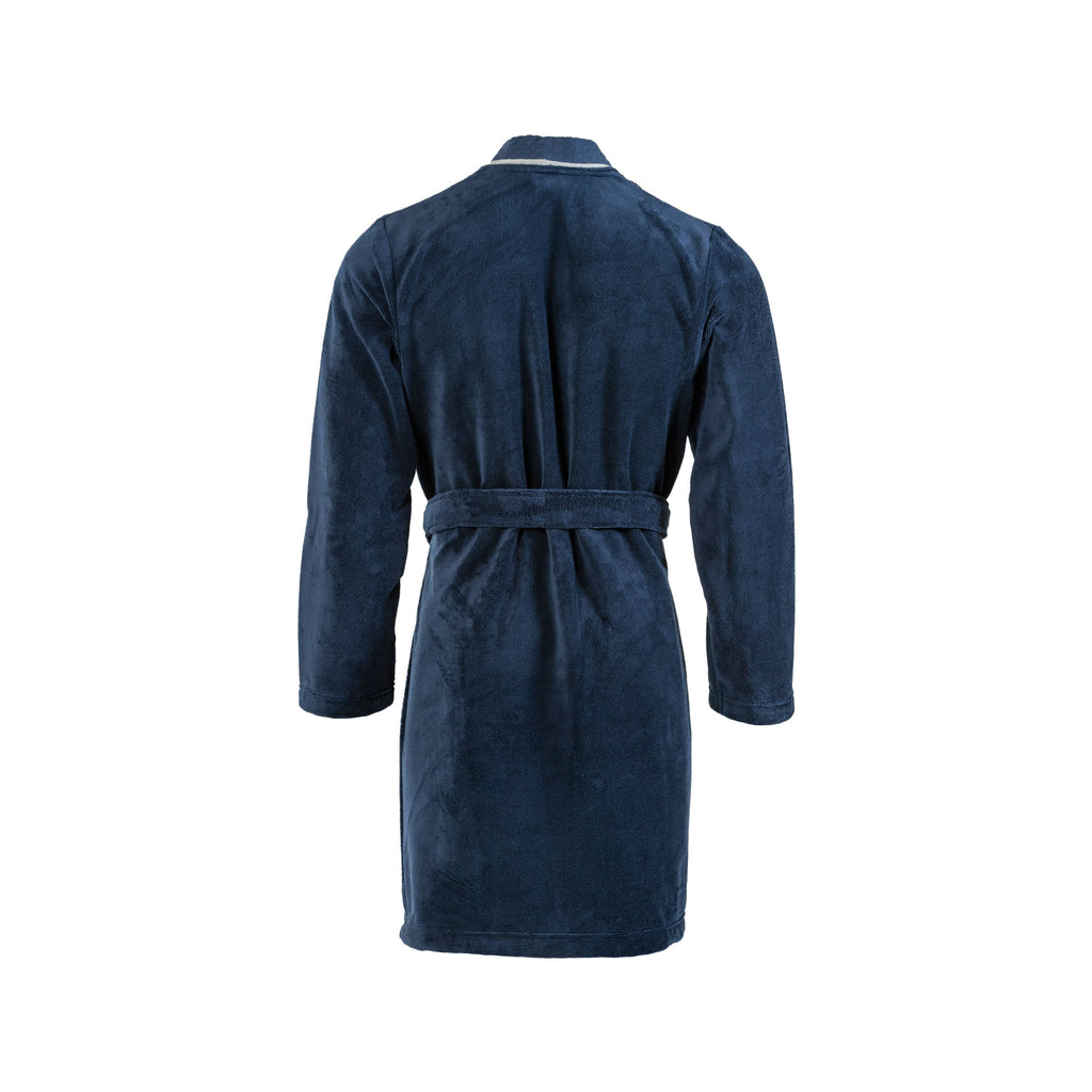Zacht en verwelkomend, de Equinoxe heren ochtendjas is marineblauw met een moderne kimono kraag. Laat je verleiden door de subtiele afwerking langs de kraag.