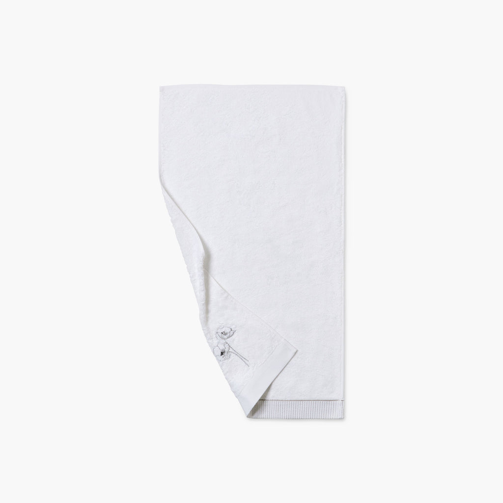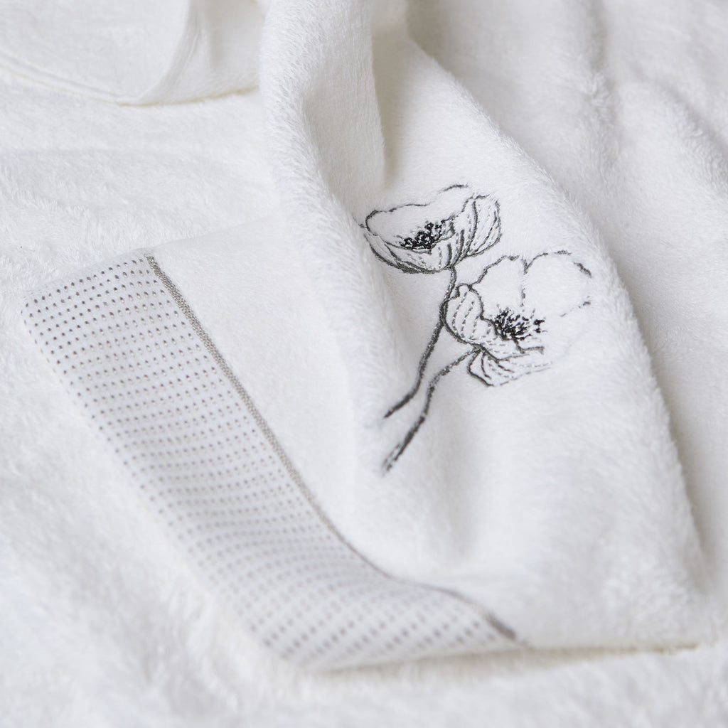 De Éphelia badset maakt deel uit van een verfijnde collectie met een rijkdom aan expertise, met de geborduurde witte klaproos, een symbool van vrede en herinnering, om een delicaat tintje aan je badkamer te geven.
