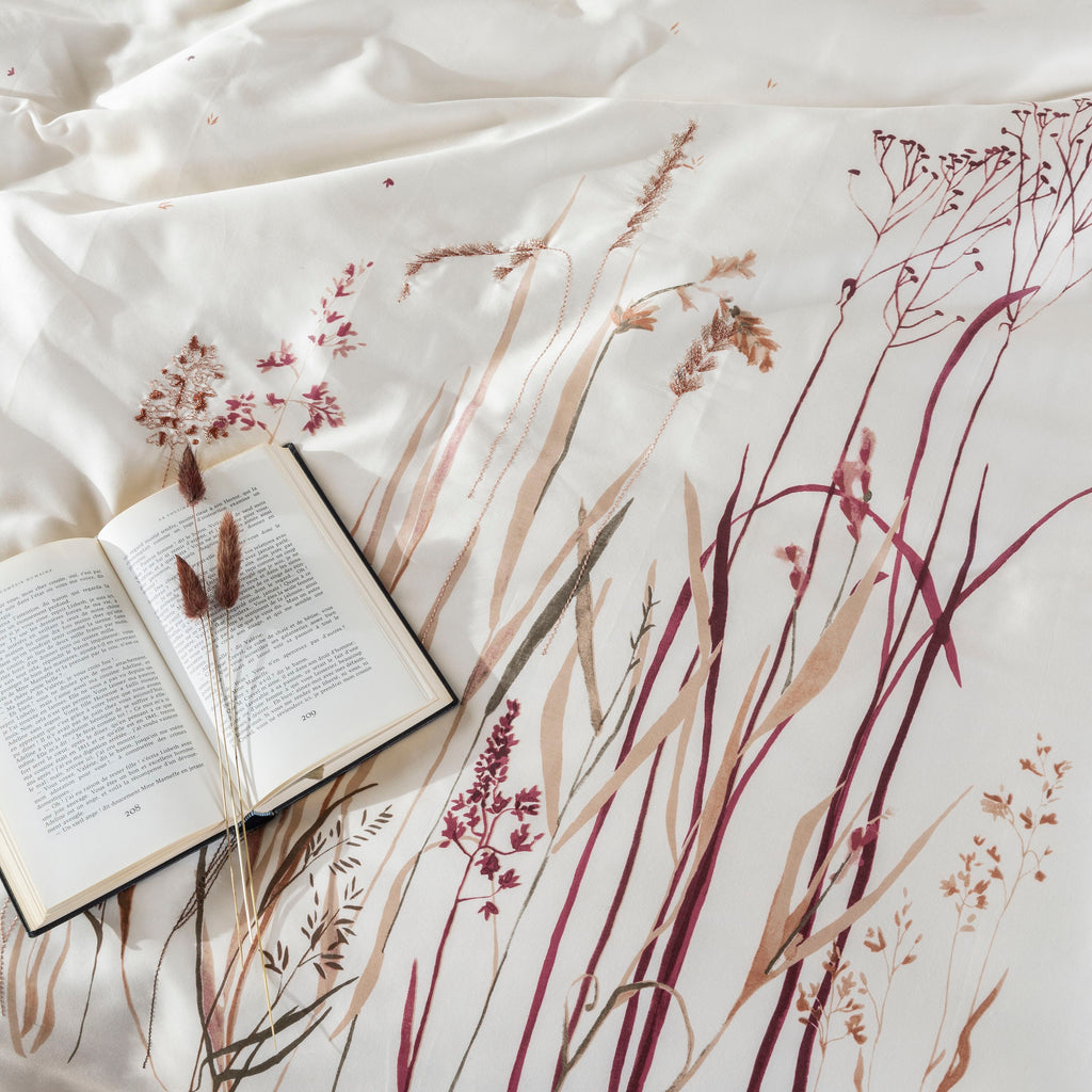 Het Aura dekbedovertrek is de uitdrukking van uitzonderlijk vakmanschap. Bewonder de combinatie van een gedrukt aquarelmotief en delicaat borduurwerk in ingewikkelde steken, met gebruik van satijn- en metaaldraden.