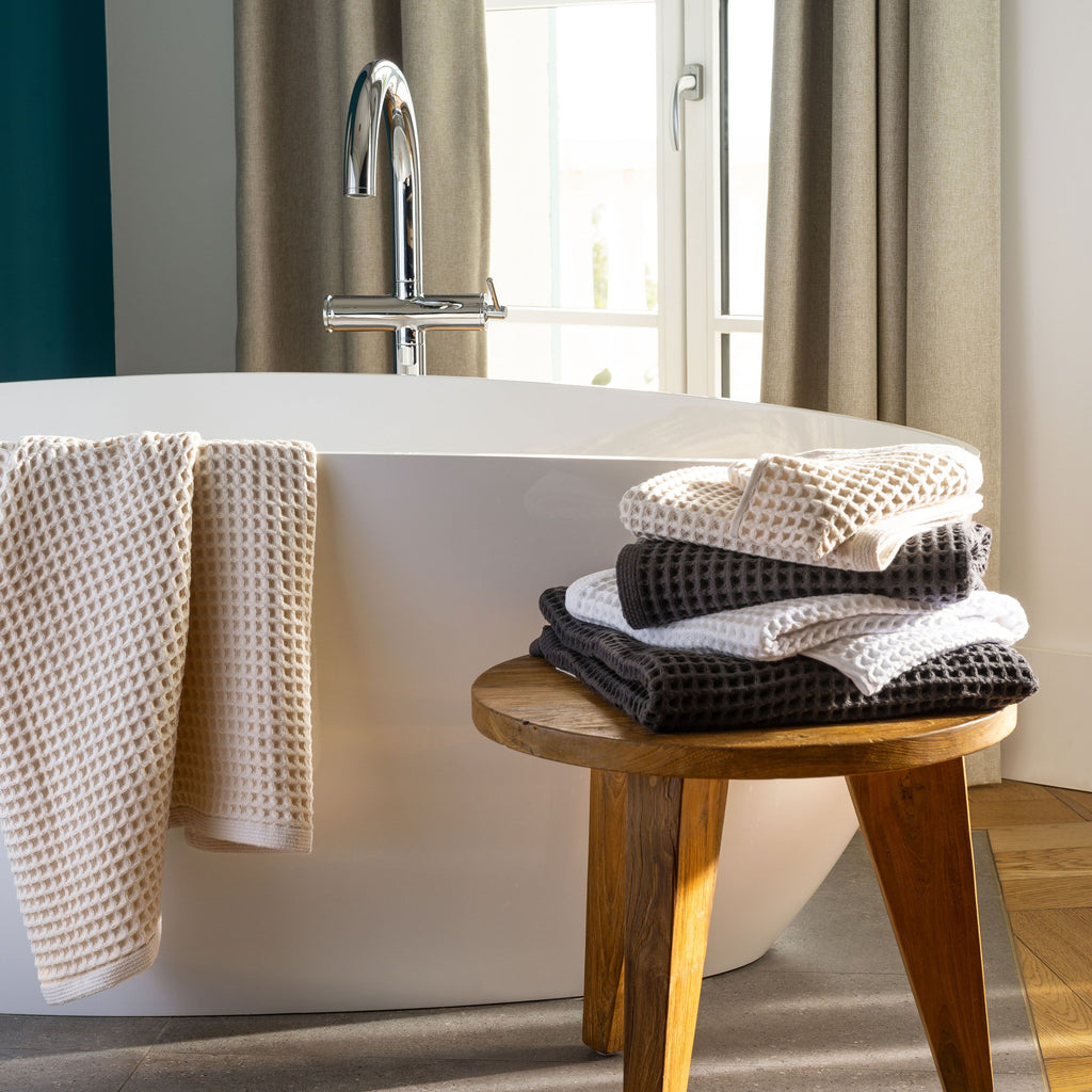 Dompel jezelf onder in een cocon van zachtheid met het Quadro biologisch honingraat badlaken. Verkrijgbaar in wit, naturel en houtskool, voor een rustgevende ambiance die zeker in de smaak zal vallen.