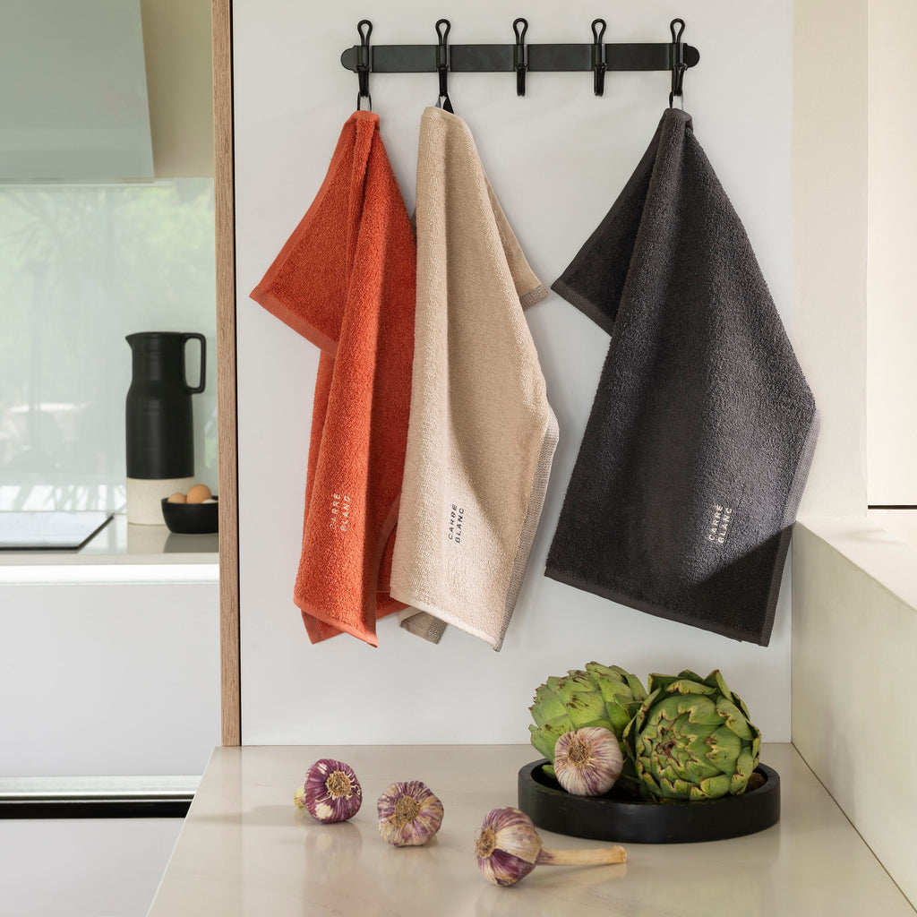 Val voor de Signature geborduurde handdoek, een essentieel onderdeel van je routine. Deze handdoek is ideaal voor in de keuken en verkrijgbaar in drie tijdloze kleuren: greige, charcoal en terracotta, om je interieur compleet te maken.