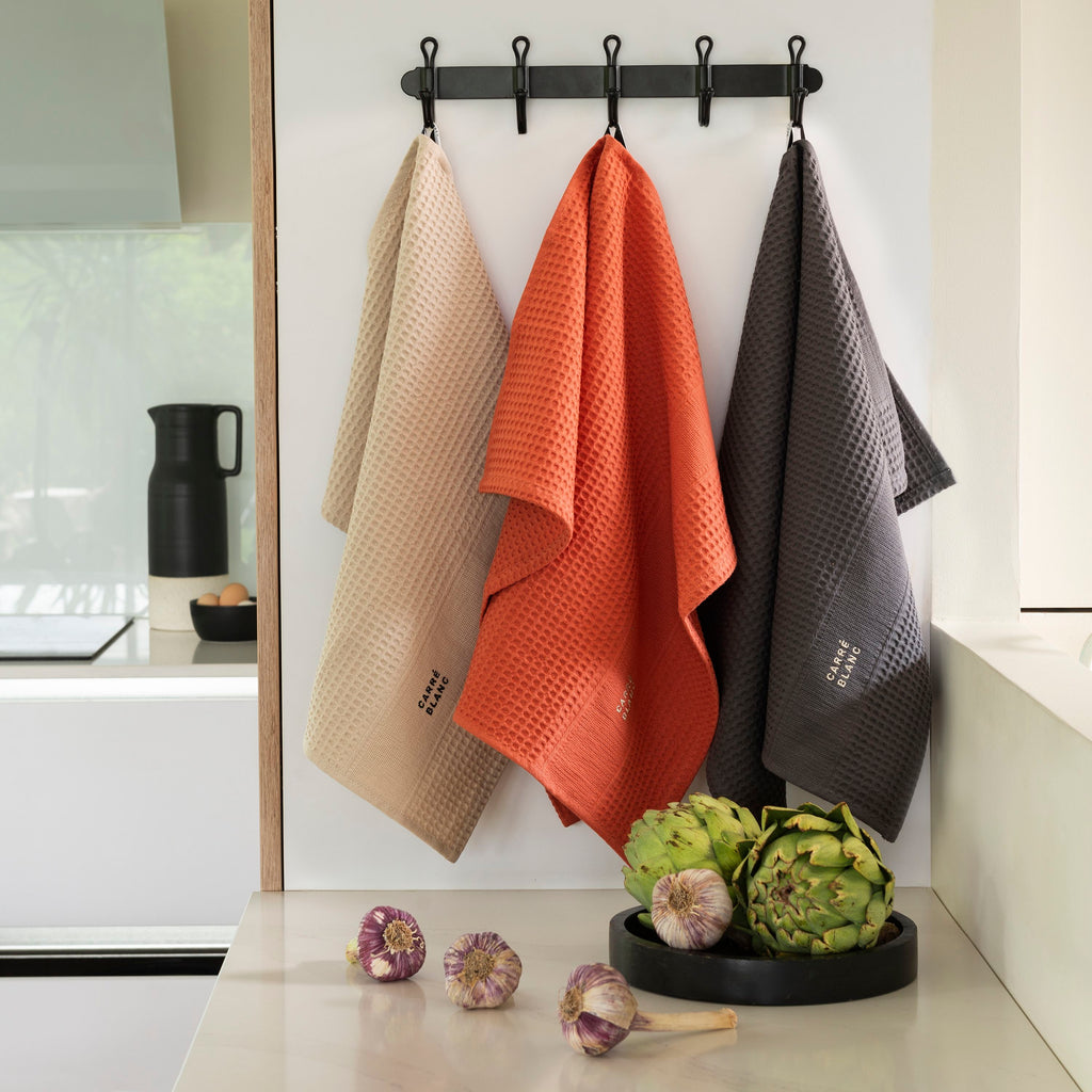 Gebruik de Signature honingraat theedoek. Gemaakt van puur katoen voor een zacht gevoel en perfecte absorptie. Verkrijgbaar in 3 kleuren: greige, charcoal en terracotta.