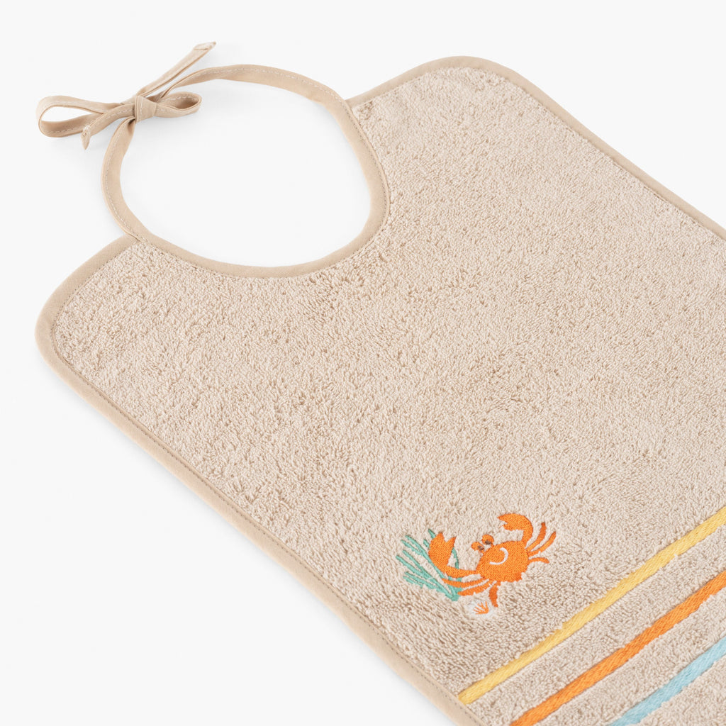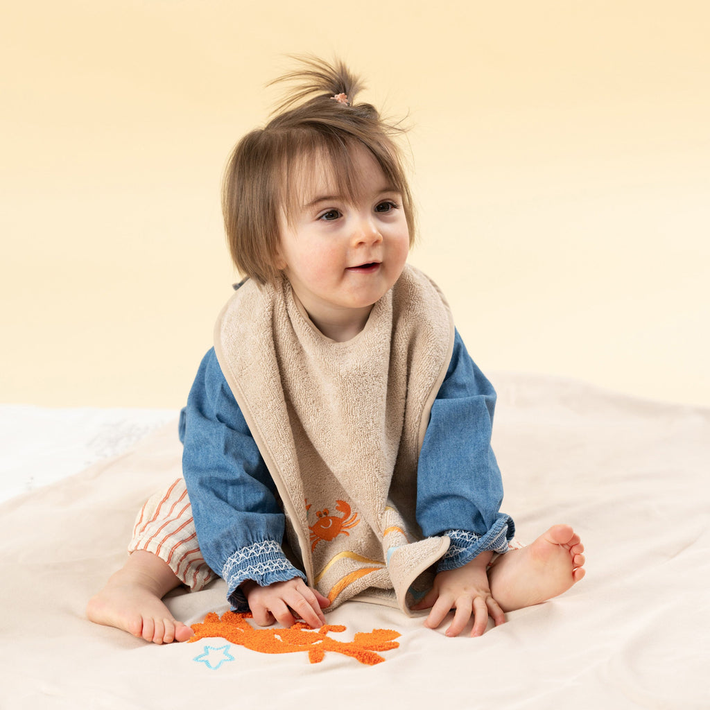 La collection Escapade marie des couleurs vives à un fond sable tout doux. Une broderie de crabe apporte une touche de malice, pour des moments de bain pleins de joie.