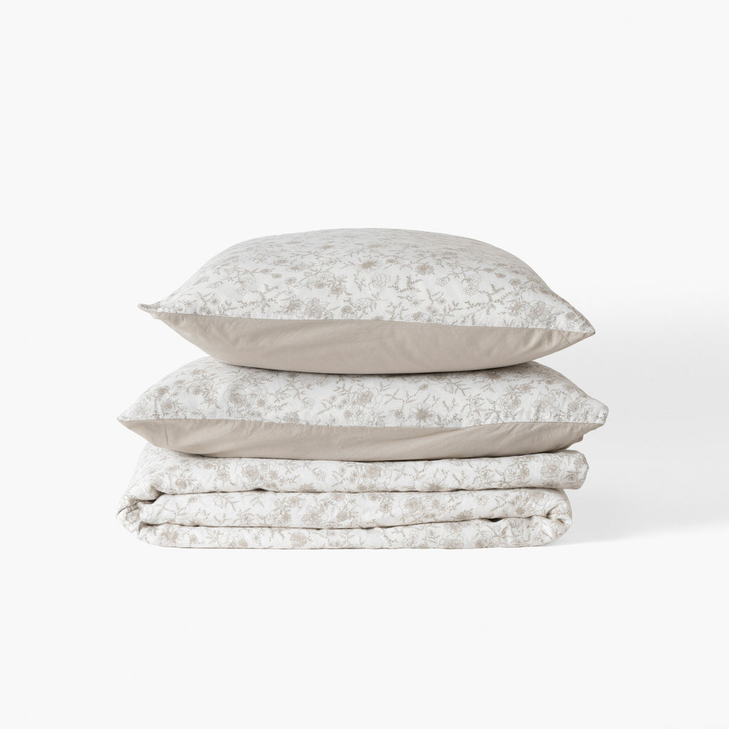 Laat je verleiden door de romantische sfeer van onze Songe collectie met zijn dubbel grijs en bloemendecor. Het unieke gevoel van linnen gecombineerd met kleine prints voor een trendy slaapkamer.
