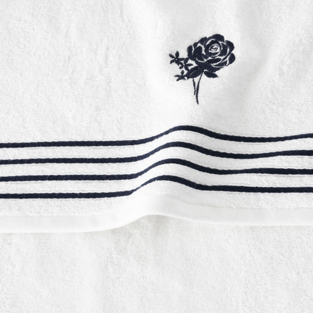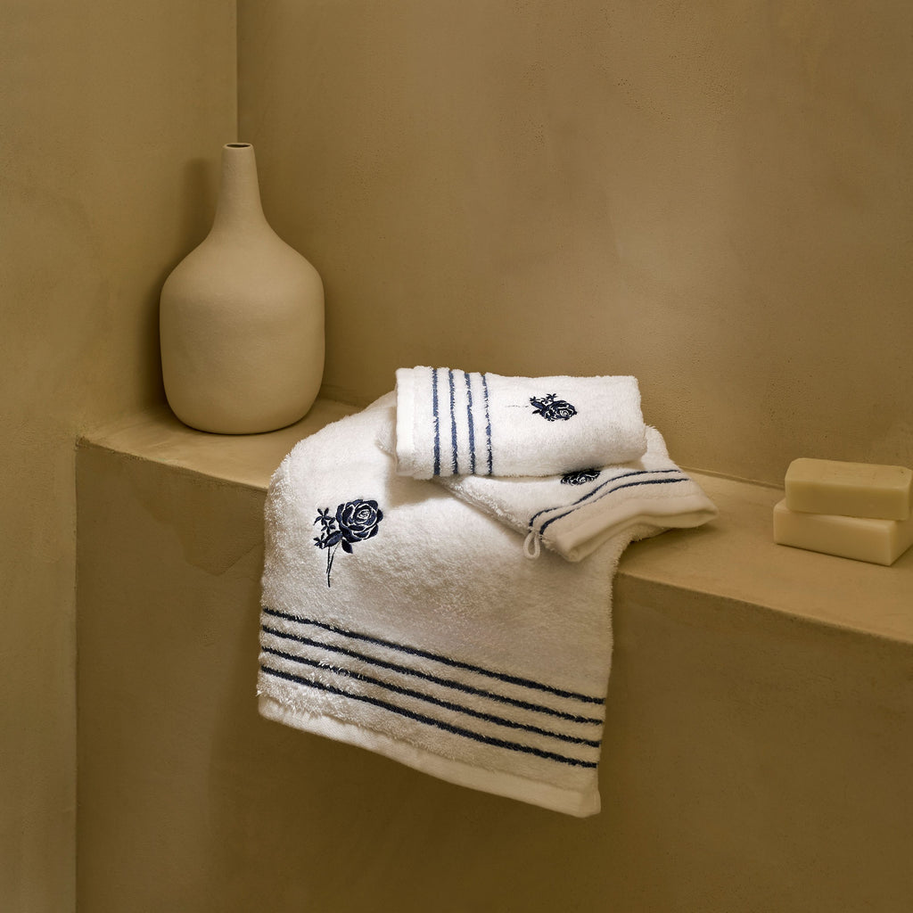 La collection Rosablue marie avec finesse le style floral et bord de mer. Son bouquet brodé, associé aux rayures, apporte une touche de raffinement unique à votre salle de bain.
